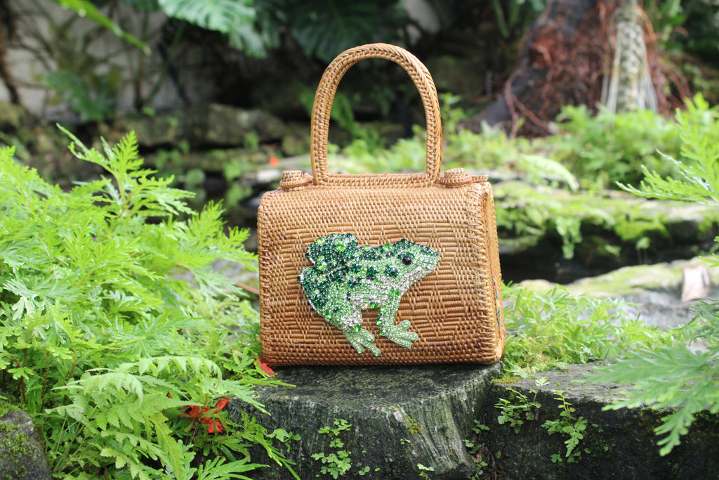 The Forest Frog Weave brings a touch of whimsy with its vibrant green frog motif, embroidered with precision. Made from sturdy Ata grass and smoked for a caramel finish, this bag is a unique blend of nature-inspired charm and traditional craftsmanship.