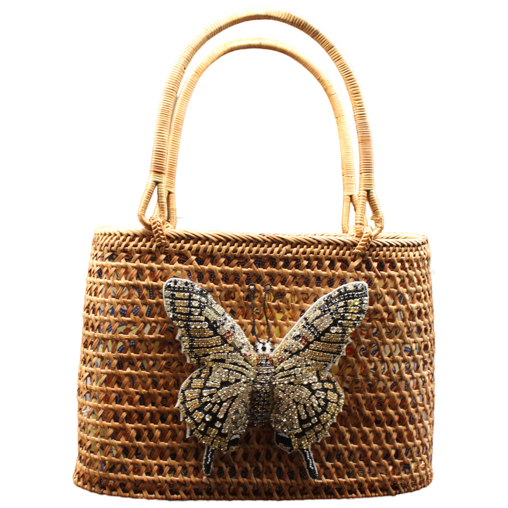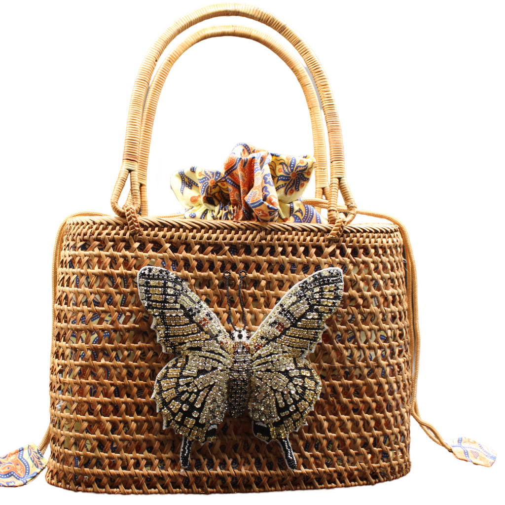 The Luxe Flora tote offers a classic butterfly design adorned with rhinestones. This spacious bag is handwoven from Ata grass, smoked for a beautiful caramel finish, and crafted to add a subtle touch of luxury to everyday style.