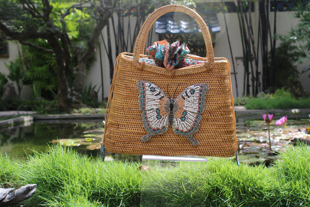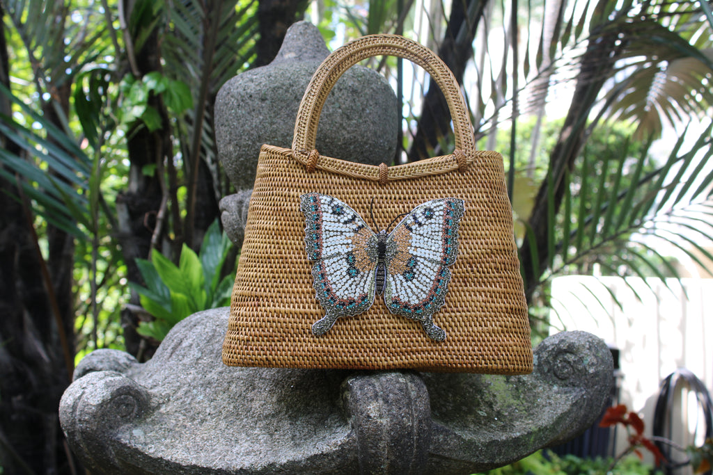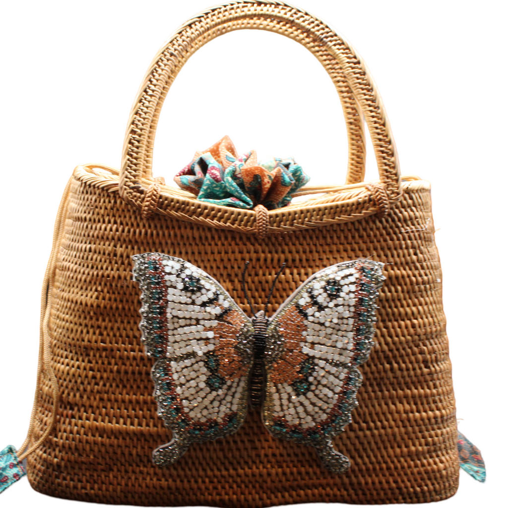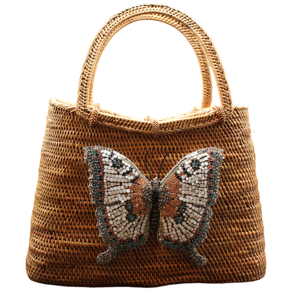 The Rhinestone Butterfly Rattan II brings elegance to everyday style with its butterfly motif adorned in rhinestones. Crafted from Ata grass and smoked for a unique caramel hue, this bag adds a delicate charm to any outfit.