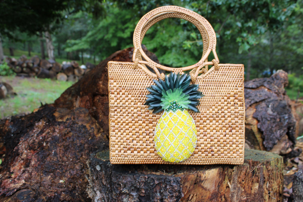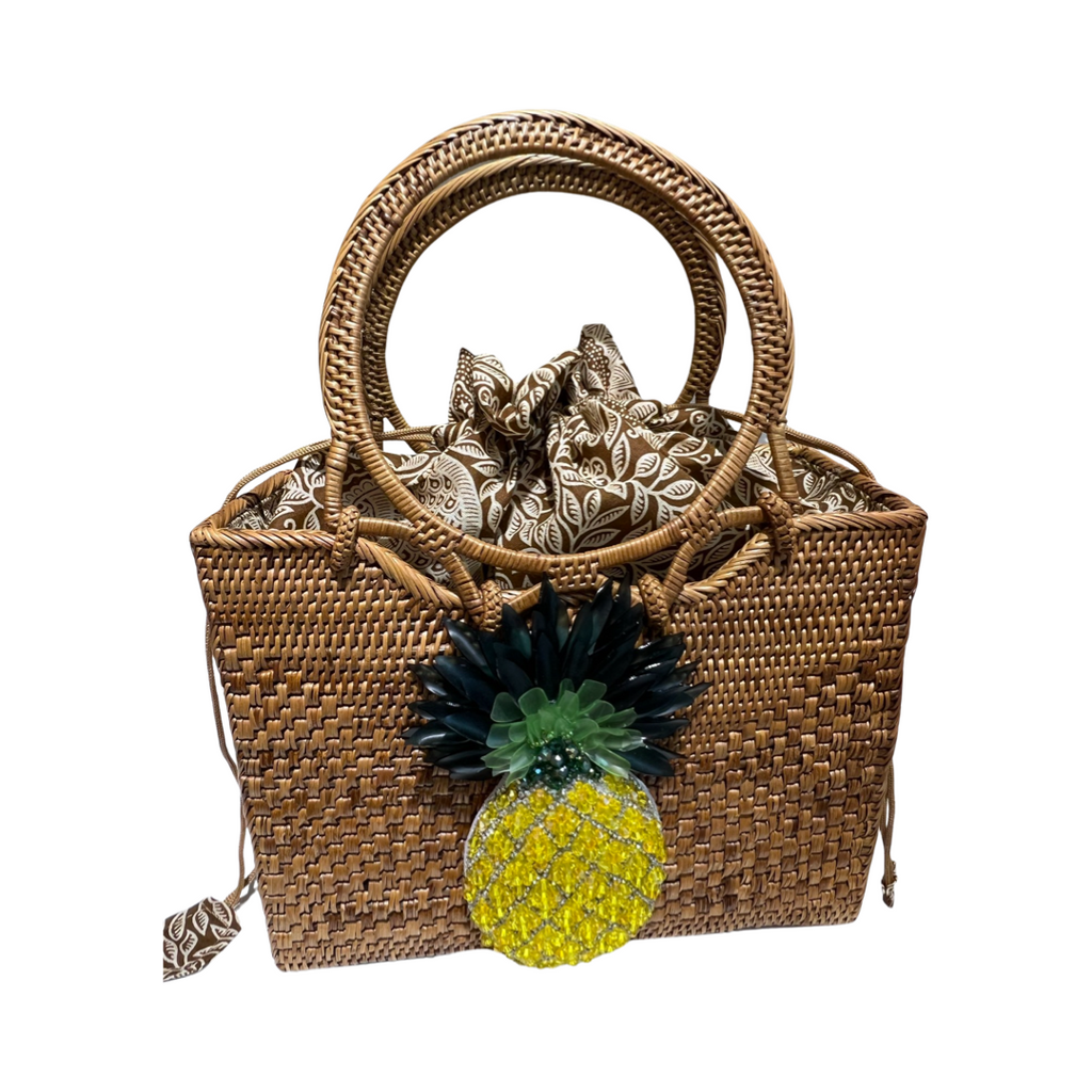 The Tropical Bloom is a playful yet sophisticated handbag, featuring a beautifully embroidered pineapple design. This handwoven Ata grass bag is smoked to achieve a warm caramel tone, perfect for summer days or adding a hint of tropical charm to any outfit.