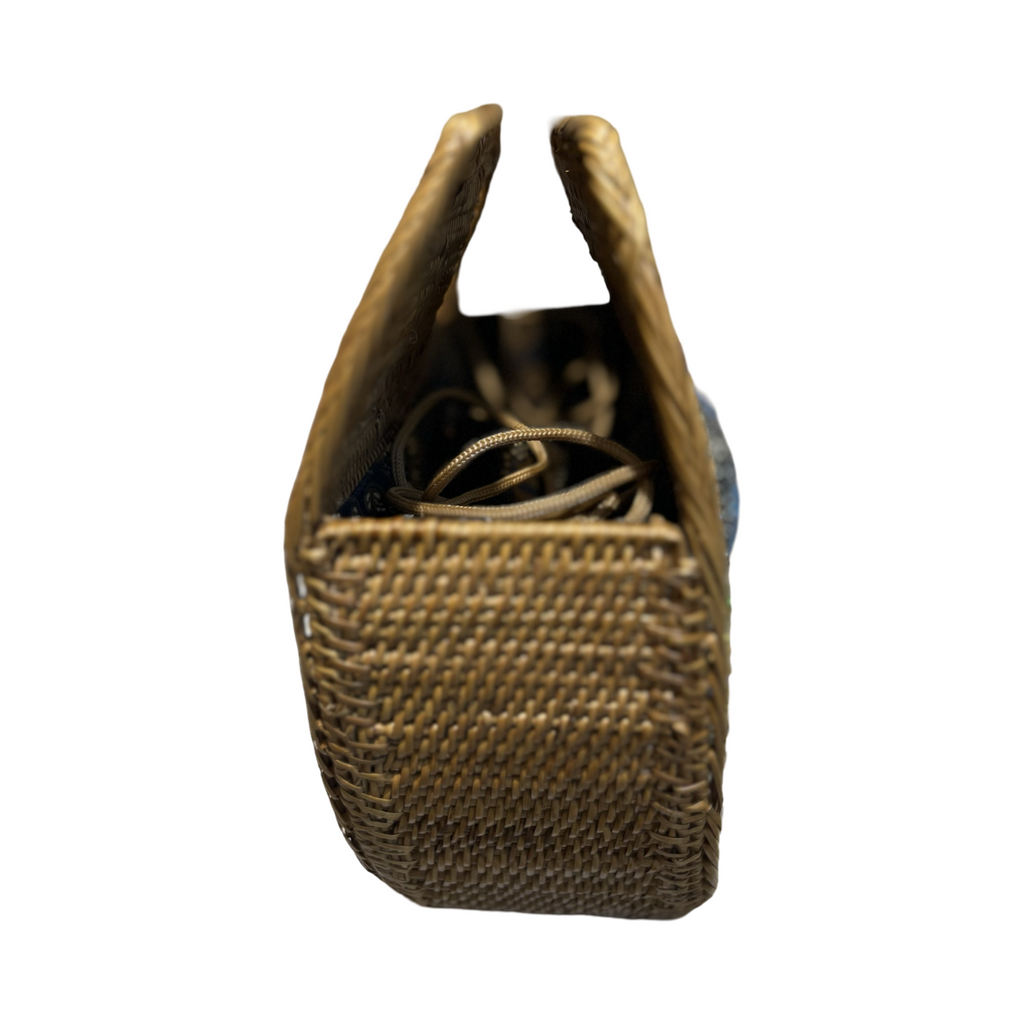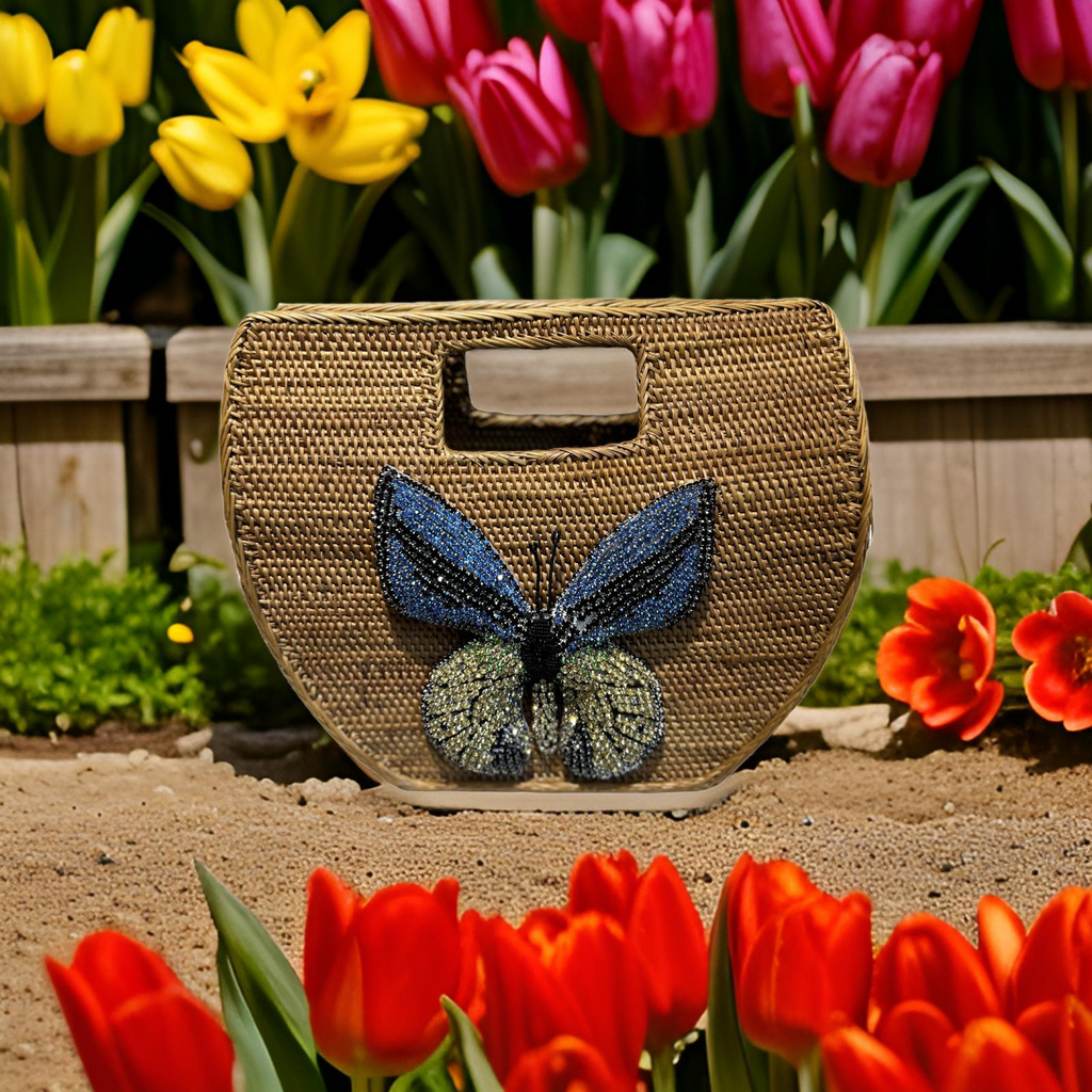 The Butterfly Bloom bag features a delicate butterfly design, accented with rhinestones to add a touch of sparkle. Handwoven and smoked for its caramel color, this piece reflects the beauty of nature and traditional craftsmanship.