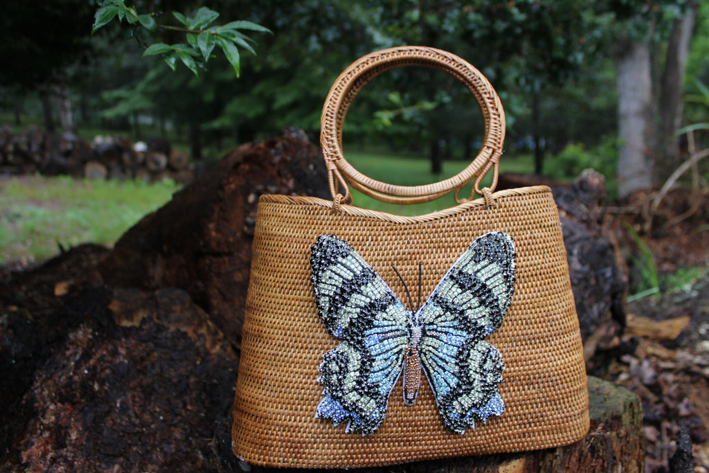 The Heritage Butterfly handbag showcases a delicate butterfly motif enhanced by rhinestone accents. Each bag is meticulously handwoven from Ata grass and smoked over coconut husks for its caramel finish. This elegant piece captures the essence of timeless craftsmanship, blending Indonesian weaving with intricate, hand-applied detailing.