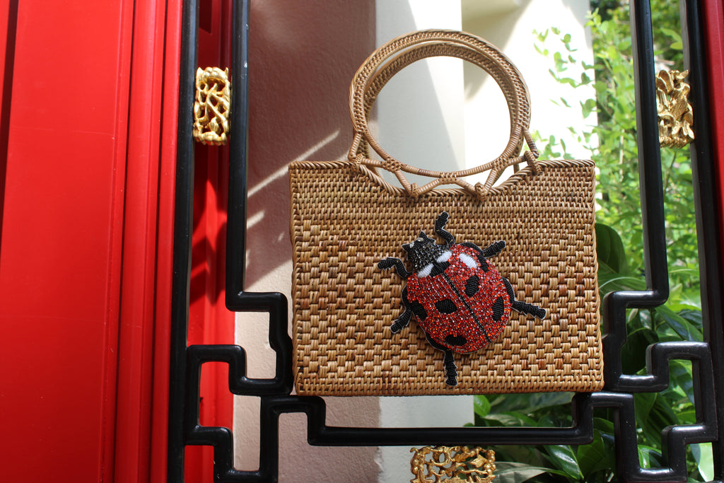 The Beaded Ladybug Charm is a playful yet elegant handbag featuring a rhinestone-embellished ladybug motif. Handwoven from Ata grass and smoked for its warm, natural color, this bag reflects the artistry and care invested in every detail.