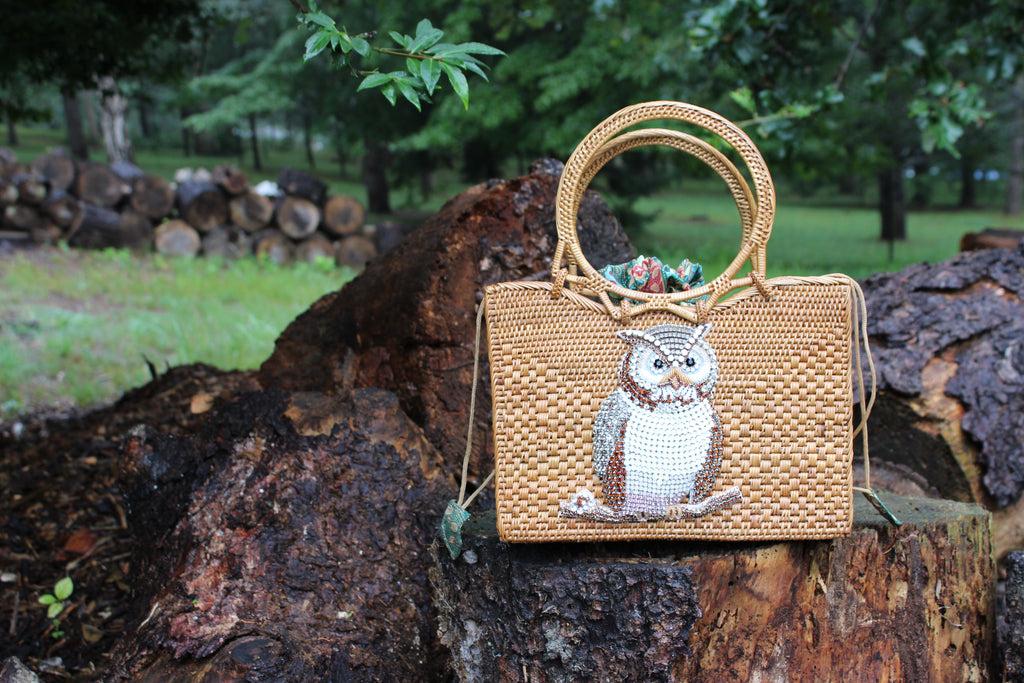 The Owl Night Charm captures the mysterious allure of the owl with its intricate embroidery and subtle rhinestone details. Handwoven and smoked for a warm finish, this bag brings a bit of nocturnal beauty to your style.