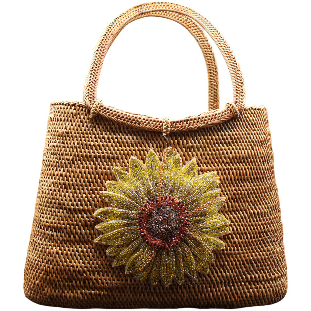The Sunflower Luxe captures the joy of nature with an embroidered sunflower motif, elevated by Swarovski crystals. Crafted from Ata grass and smoked to a deep caramel hue, this bag adds a touch of luxury to everyday elegance.
