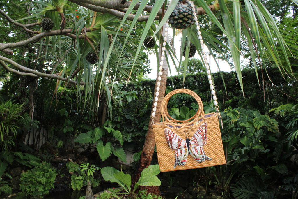The Crystal Flight handbag, featuring an embroidered butterfly motif and Swarovski accents, comes with detachable straps for versatile styling. Handwoven from Ata grass and smoked over coconut husks, it’s the perfect blend of luxury and function.