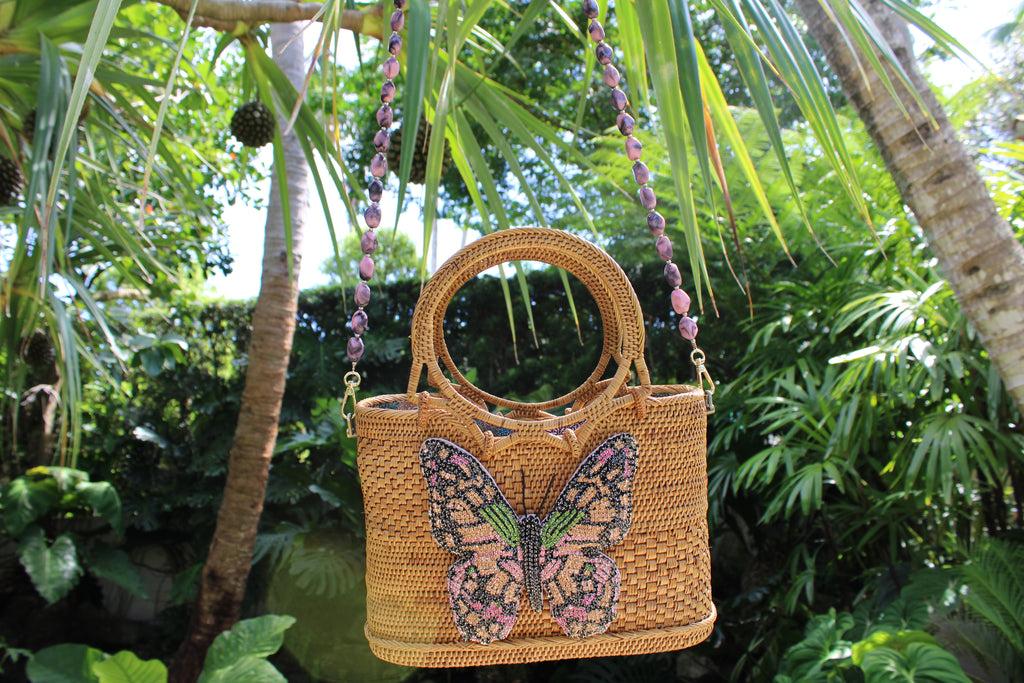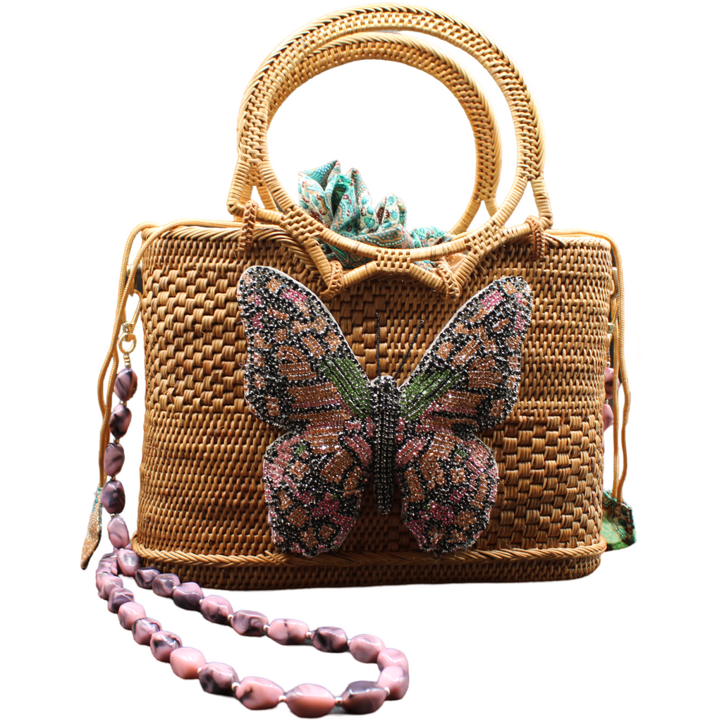 The Cepora exemplifies timeless elegance with its beautifully embroidered butterfly motif, adorned with delicate Swarovski crystals. Handwoven from durable Ata grass and smoked over coconut husks for 24 to 48 hours, this bag showcases a warm caramel hue that complements its classic butterfly design.